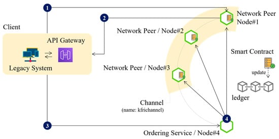 - Transaction Proposal Submission:A client retrieves relevant food safety data from the legacy system and submits a transaction proposal via the API gateway to the designated endorsement peer. The transaction is proposed to a predefined blockchain channel, “kfrichannel”, ensuring that only authorized network participants can process transactions.