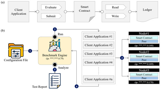 Measured transaction processing performance in the blockchain network: (a) benchmarking workflow, (b) performance evaluation process. Part of the IP address is asterisked due to security issues.