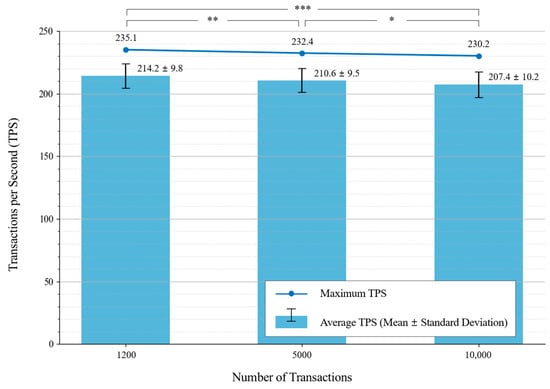 Figure 6 shows the benchmarked transaction processing throughput under varying transaction loads. The bar plot represents the mean ± standard deviation of transaction throughput, while the line plot indicates the maximum TPS recorded. Statistical significance between groups is denoted using asterisks: p < 0.05 (*), p < 0.01 (**), p < 0.001 (***) [28]. These statistical differences indicate that, although the numerical differences in TPS values appear small, they are statistically significant, meaning the system experiences a measurable decrease in throughput as transaction volume increases.