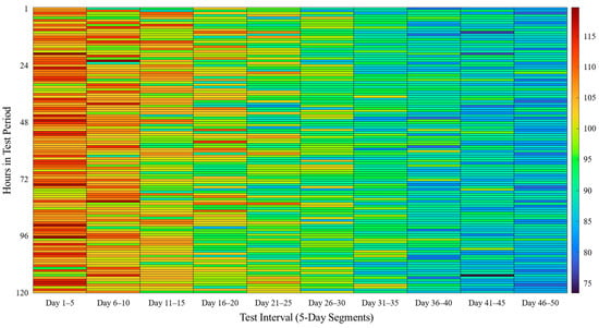 Figure 7 represents the hourly transaction logging patterns over 50 days using a heatmap, where red shades correspond to higher transaction volumes and blue shades indicate lower transaction volumes. The x-axis represents the test interval (in days), while the y-axis represents the time interval (in hours) across the 120 h span of each test period. The color intensity shows the number of transactions logged per hour.
