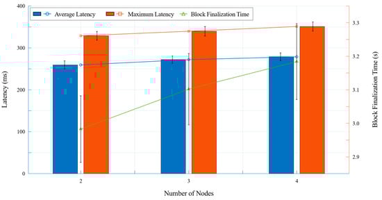 Figure 8 provides a graphical representation of the impact of network expansion on transaction latency and block finalization time. The x-axis represents the number of nodes, set at 2, 3, and 4, while the y-axis incorporates two distinct metrics. The left y-axis represents transaction latency in milliseconds, where average transaction latency is depicted by blue bars and a corresponding line, while maximum transaction latency is shown in orange. The right y-axis denotes block finalization time in seconds, illustrated by a green line. This visualization highlights the increasing trend in latency as the number of nodes grows, alongside the relatively stable progression of block finalization time, offering insights into the computational overhead introduced in a permissioned blockchain network utilizing the Raft consensus mechanism.