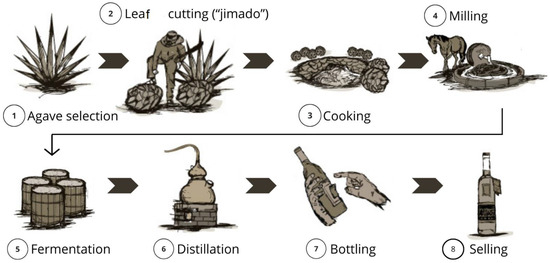 In 2020, Mexico produced 1,913,026 tons of Agave from 25,741 Ha to 129,982 Ha of a total area dedicated to this succulent; of this, close to 80% was destinated to blue Agave for tequila production, and the rest was used for mezcal, pulque, and other products [33]. The national mezcal production in 2022 was 14,165,505 L, and it has been significantly increasing in the last decade. Oaxaca producers export around 8.5 million liters of mezcal to 81 different countries [34]. The Mexican government estimated that 5728 people were formally employed in the tequila and mezcal industries in 2019 [35]; however, most producers are informal employees. So, only in Oaxaca, 48,000 families are dedicated to the artisanal production of this spirit [34]. Then, most of the mezcal production is traditionally organized as a family activity, and the production and elaboration technologies have spanned generations for centuries. However, the growing national and global demand for this beverage is changing the production market, land use, and social relations in the producers’ communities [36].