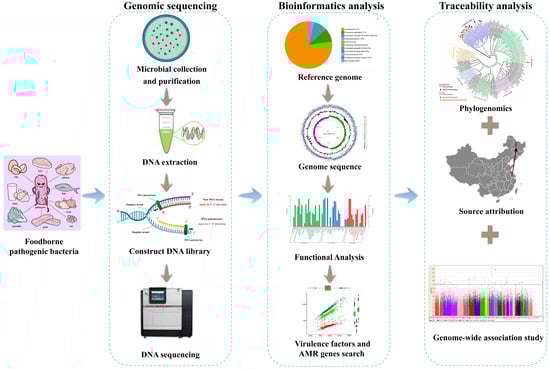One of the most crucial assurances of good health is safe food. According to the World Health Organization (WHO) [], as many as 600 million, or almost 1 in 10 people in the world each year, fall ill after consuming contaminated food. In addition to having a significant negative influence on people’s health, foodborne disease also has serious economic repercussions for families, societies, businesses, and nations []. However, as people’s living standards continue to improve, their demand for diversified and high-quality food also increases, which has led to an increasingly complex supply chain in the global food industry []. However, this complexity has increased the risk of outbreaks of foodborne diseases, making it much more difficult to trace their origins []. Therefore, the most important issue currently is how to quickly and accurately identify the sources and transmission pathways of foodborne pathogens, including determining how pathogens are introduced during food production and processing [].