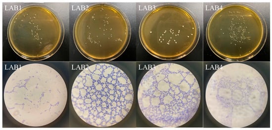We obtained four pure bacterial colonies, namely, LAB1, LAB2, LAB3, and LAB4. These isolates were preserved in the probiotic library maintained by the Department of Food Science at Nanjing Normal University. Following purification, colonies of each strain were added to MRS plates, where they eventually exhibited a white or milky-white coloration; they were round with smooth surfaces and well-defined edges (Table A7). They also displayed positive Gram staining characteristics. Under a microscope, the bacteria appeared as rod-shaped cells arranged individually, in pairs, or in chains (Figure 1).