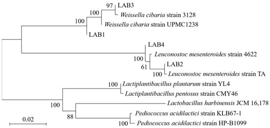 The bacteria were subsequently identified through biochemical and physiological characteristics (Table A8) and 16S rRNA sequencing (Appendix B). The NCBI database was utilized to conduct similarity and sequence homology comparisons (Figure A4), while a phylogenetic tree was constructed using MEGA 11.0 software (Figure 2). The identified species were Weissella cibaria (LAB1, LAB3) and Leuconostoc mesenteroides (LAB2, LAB4) (Table 1).