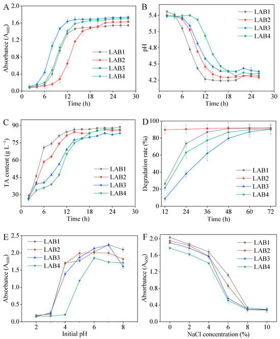 A high-quality starter should be able to withstand a pH of approximately 4.0, thereby enhancing fermentation efficiency and shortening fermentation time. The growth of all four strains was inhibited at pH levels of 2.0 and 3.0. All but LAB4 showed robust growth at a pH of 4.0. LAB4 was optimal at pH 6.0 and the remaining three were optimal at pH 7.0 (Figure 3E). The higher lag phase of LAB4 suggests possible metabolic adaptations that require further exploration.