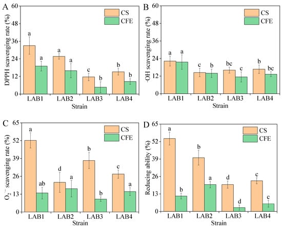 DPPH (A), OH (B), and O2− (C) scavenging rate and reducing ability (D) of four lactic acid bacteria strains isolated from the pickled potherb mustard. Within the same index, different lowercase letters are significantly different (p < 0.05). CS, cell suspension; CFE, cell-free extract; DPPH, 2,2-diphenyl-1-picrylhydrazyl; ·OH, hydroxyl radical; O2·−, superoxide anion.