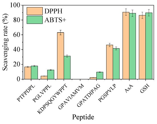 DPPH and ABTS+ scavenging rate of six synthetic peptides. DPPH, 2,2-diphenyl-1-picrylhydrazyl; ABTS+, 2,2′-azinobis (3-ethylbenzothiazoline-6-sulfonic acid); AsA, ascorbic acid; GSH, glutathione.