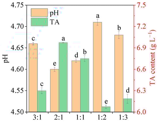 The impact of varying proportions of LAB (LAB1:LAB2) on pH and TA is illustrated in Figure 6. At a ratio of 2:1, the fermentation system achieved the lowest pH value and highest TA (p < 0.05). Consequently, the optimal inoculation ratio for mixed fermentation was determined to be 2:1 (LAB1/LAB2).