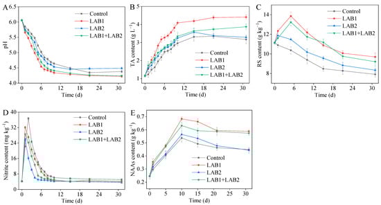 The changes in pH and TA during fermentation are presented in Figure 7A,B. The initial pH was 6.06 and the TA was 1.2 g/L on day 0. After a fermentation period of 10 days, both LAB1 and LAB1+LAB2 exhibited pH values below 4.5, with LAB1 reaching a minimum pH of 4.34 and TA exceeding 4.0 g/L. It is worth noting that inoculation with LAB1 significantly accelerated the decline in pH during fermentation, thereby facilitating its overall progress.