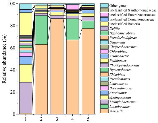 At the genus level (Figure 8), Methylobacterium and Sphingomonas were the predominant genera prior to fermentation (control 0 d), making up 27.79% and 16.16% of the sample, respectively. Following a fermentation period of 31 days, there was a significant decrease in their proportions across all groups (p < 0.05). In the control 31 d group, Weissella and Lactobacillus emerged as dominant genera, accounting for 65.21% and 26.05% of the sample, respectively. In LAB1 31 d, Weissella dominated with a proportion of 86.31%, while the proportion of Lactobacillus was only 0.2%, significantly lower than the other groups. In both LAB2 31 d and LAB1+LAB2 31 d, Weissella and Lactobacillus were the predominant bacterial species, accounting for 67.22% and 19.20%, and 77.52% and 6.91% of the samples, respectively (Table A13). The strong dominance of Weissella in LAB1 could be due to the higher acid tolerance of Weissella compared to Lactobacillus, and the inhibitory compounds produced by LAB1 that selectively favored Weissella. Therefore, the involvement of Weissella in the fermentation process of PPM is significant. It is speculated that this genus may play a major role in the fermentation of PPM.