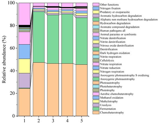 Figure 9 describes the functions of microorganisms before and after fermentation. Chemoheterotrophy and fermentation significantly increased in each group compared to control 0 d, whereas the processes of ureolysis, methylotrophy, methanol oxidation, aerobic chemoheterotrophy, and phototrophy significantly decreased (p < 0.05) (Table A14).