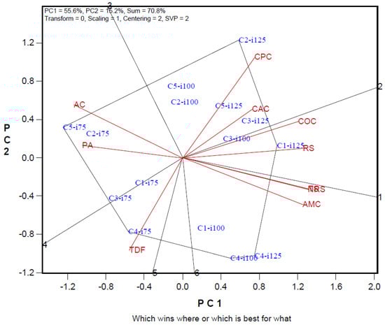 Polygon views of the biplot based on symmetrical scaling for the which-won-what pattern for irrigation maize cultivars and biochemical parameters. C1: Syngenta Inove; C2: Tareks OSSK644; C3: Pioneer PR31G98; C4: Syngenta Dracma; C5: Pioneer PR31Y43; i75: I75-75%; i100: I100-100%; i125: I125-125%; COC: crude oil; CPC: crude protein; TDF: total dietary fiber; PA: phytic acid; AC: amylose; AMC: amylopectin; RS: resistant starch; NRS: non-resistant starch; TS: total starch; CAC: crude ash.