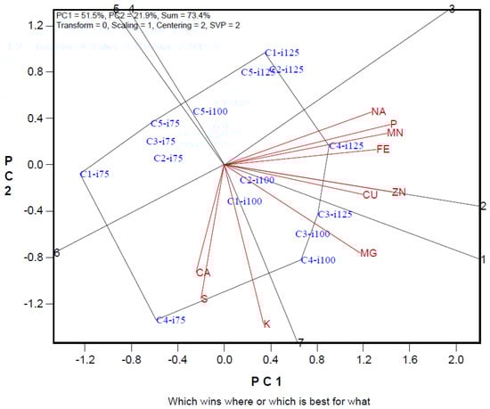 Polygon views of the biplot based on symmetrical scaling for the which-won-what pattern for irrigation maize cultivars and mineral contents. C1: Syngenta Inove; C2: Tareks OSSK644; C3: Pioneer PR31G98; C4: Syngenta Dracma C5: Pioneer PR31Y43; i75: I75-75%; i100: I100-100%; i125: I125-125%.