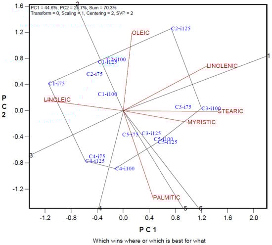 Polygon views of the biplot based on symmetrical scaling for the which-won-what pattern for irrigation maize cultivars and fatty acid composition. C1: Syngenta Inove; C2: Tareks OSSK644; C3: Pioneer PR31G98; C4: Syngenta Dracma; C5: Pioneer PR31Y43; i75: I75-75%; i100: I100-100%; i125: I125-125%.