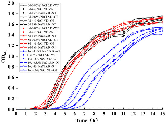 The growth curves of the two strains were assessed at different NaCl concentrations on days 0, 8, and 16, respectively. Each experiment group was transferred to TSB at a 1:100 dilution ratio and incubated at 37 °C with shaking at 180 rpm/min. The optical density (OD) at 600 nm (OD600) was monitored, with the OD value of the sterile culture solution serving as the baseline. Subsequent measurements of OD600 were taken hourly, with monitoring continuing for from 12 to 15 h until the cultures reached a stable growth phase.
