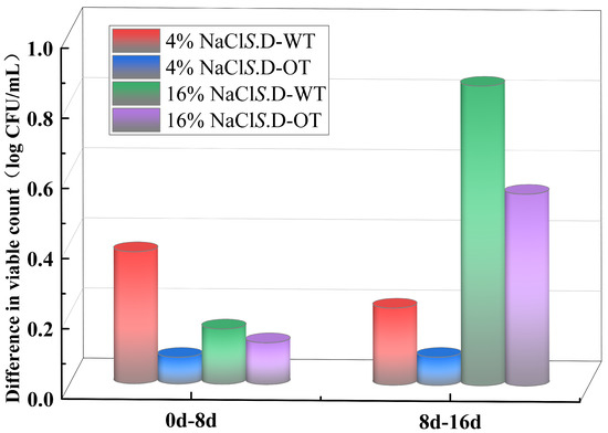 Reduction in viable cell counts of S. D-WT and S. D-OT at different NaCl concentrations over distinct time intervals (0–8 days, 8–16 days).