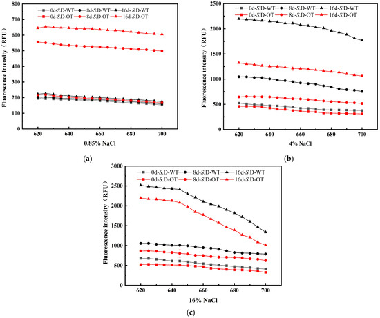 Fluorescence spectra of PI-stained S. D-WT and S. D-OT cells with membrane damage after 0, 8, and 16 days of exposure to 0.85%, 4%, and 16% NaCl solutions. (a) 0.85% NaCl solutions; (b) 4% NaCl solutions; (c) 16% NaCl solutions.