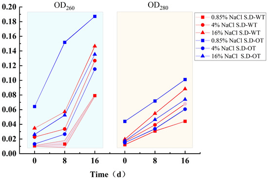 Nucleic acid and protein leakage in S. D-WT and S. D-OT after 0, 8, and 16 days of exposure to 0.85%, 4%, and 16% NaCl solutions.