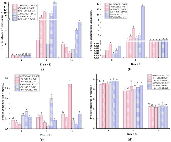Intracellular solute concentration in S. D-WT and S. D-OT after 0, 8, and 16 days of exposure to 0.85%, 4%, and 16% NaCl solutions. (a) Intracellular K⁺ concentration (mmol/g prot); (b) intracellular trehalose concentration (mg/mg prot); (c) intracellular betaine concentration (mg/mL); (d) intracellular proline concentration (μg/mL). Data were presented as mean ± SD (n = 3). Different lowercase letters indicated significant differences among treatment groups (0.85%, 4%, and 16% NaCl solutions) at the same time point (0, 8, and 16 days), as determined by Duncan’s test (p < 0.05).