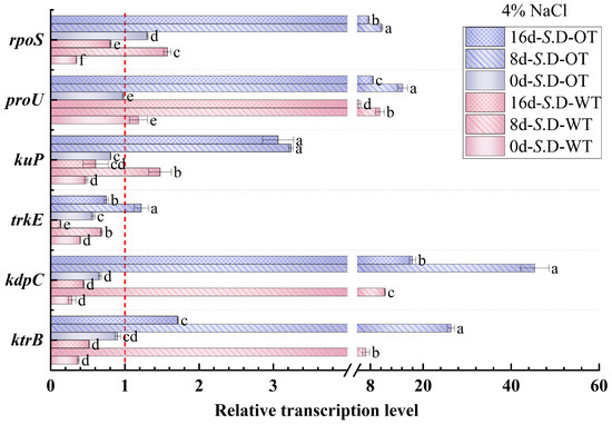 Gene transcription levels of S. D-WT and S. D-OT during 4% NaCl exposure (0, 8, and 16 days) are presented. Data were presented as mean ± SD from four biological replicates (n = 4). Relative transcription levels were calculated using the 2^(−ΔΔCt) method with the untreated S. D-WT strain as the calibrator. Values >1, <1, and =1 indicated upregulation, downregulation, and no change, respectively. Different lowercase letters indicated statistically significant differences (p < 0.05) in transcript fold-changes among experimental groups as determined by Duncan’s multiple range test.