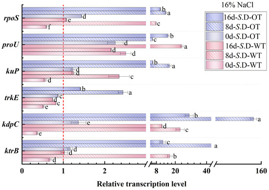 Gene transcription levels of S. D-WT and S. D-OT during 16% NaCl exposure (0, 8, and 16 days) are presented. Data were presented as mean ± SD from four biological replicates (n = 4). Relative transcription levels were calculated using the 2^(−ΔΔCt) method with the untreated S. D-WT strain as the calibrator. Values >1, <1, and =1 indicated upregulation, downregulation, and no change, respectively. Different lowercase letters indicated statistically significant differences (p < 0.05) in transcript fold-changes among experimental groups as determined by Duncan’s multiple range test.