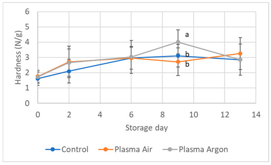 Texture parameter of Hardness (N/g) measured in the seabream fillets during refrigerated storage. Data are expressed as Log CFU/g sample and are mean ± SD of 3 biological replicates in each condition. Statistical analysis was by the one-way ANOVA using Tukeys’ as post-test and assuming p < 0.05 as significant. Different letters indicate statistical significance.