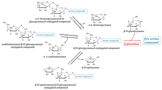 The enzymatic hydrolysis of glycosidically bound aroma compounds occurs in two steps and involves different exoglycosidases depending on the sugar moieties of the substrates. For example, in the presence of rhamnose or apiose: first, a α-L-rhamnosidase or a β-D-apiofuranosidase cleaves the (1-6)-glycosidic linkage, and then, the flavor compounds are liberated from the monoglucosides by the action of a β-glucosidase. A hydrolysis scheme of glycosidic aroma precursors is shown in Figure 1.