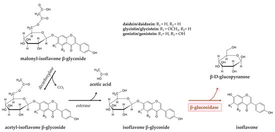 Aglycones’ release is due to β-glucosidase activity on β-glucosides, which in most cases are also present as malonylated and acetylated forms. In these latter cases, β-glucosidase is part of a two-step process, which also requires an esterase enzyme to remove acetylation (Figure 2).