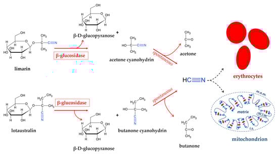 These cyanogenic glucosides are not toxic as such because they are absorbed in the gastrointestinal tract and eliminated as such through urination. However, cyanogenic glycosides are hydrolyzed into acetone cyanohydrin by the glycosidases of gut microbiota. The acetone cyanohydrin was degraded spontaneously in the small intestine in which it had alkaline pH conditions. This degradation releases hydrocyanic acid (HCN), which bound to methemoglobin (Figure 3) [135,136] and, as known, exerts its toxicity by inhibiting the cytochrome oxidase, the complex IV of mitochondrial respiratory chain, thus preventing cellular utilization of oxygen [137]. The presence of these cyanogenic glucosides is the major limiting factor to direct utilization, thereby necessitating its processing prior to consumption. The introduction of new processing methods has helped to reduce cassava’s cyanogenic content and, therefore, exposure levels to its cyanogenic compounds. Cassava is traditionally processed by a wide range of methods, such as boiling, roasting, drying, cold water leaching, or fermentation [127], which reduce its toxicity. Thus, during fermentation, the roots are softened, and there is a disintegration of the tissue structure which causes linamarin to come into contact with endogenous linamerase, which is found in the cell wall, and microbial linamerase. These enzymatic activities result in subsequent hydrolysis into glucose and acetone cyanohydrin which are easily broken down into acetone and HCN. During the natural drying phase, free HCN evaporates easily by having a boiling point of 26 °C.