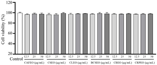 The CCK-8 assay results indicated that the six Rutaceae plant essential oils exhibited no significant cytotoxicity toward HaCaT cells at concentrations of 12.5, 25, and 50 μg/mL (Figure 1). These findings suggest that these essential oils may have good biocompatibility at low concentrations. Previous studies have demonstrated that many plant-derived essential oils possess various biological activities, including antimicrobial, anti-inflammatory, and antioxidant effects. However, cytotoxicity remains a critical factor in assessing the safety and efficacy of these essential oils [18].