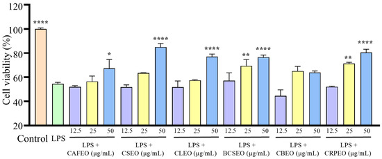 Cytotoxicity of six Rutaceae plant essential oils and LPS co-culture with RAW 264.7 cells. Data were expressed as mean ± SD. Statistical analysis was performed by one-way analysis of variance with Tukey’s multiple comparisons test, * p < 0.05, ** p < 0.01, and **** p < 0.0001.