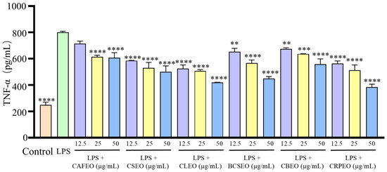 Inhibition effects of six Rutaceae plant essential oils on TNF-α production by LPS-stimulated RAW 264.7 cells. Data were expressed as mean ± SD. Statistical analysis was performed by one-way analysis of variance with Tukey’s multiple comparisons test, ** p < 0.01, *** p < 0.001, and **** p < 0.0001.