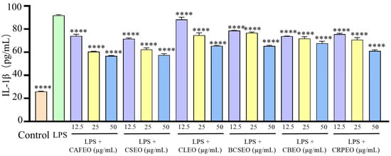 Similarly, compared to the control group, the levels of IL-Iβ in the model group also significantly increased from 25.94 ± 0.37 ng/L to 91.96 ± 0.56 ng/L. After treatment with different essential oils at concentrations of 12.5, 25, and 50 μg/mL, the inhibition rates for IL-Iβ were 19.50 ± 1.14%, 34.23 ± 0.01%, and 38.28 ± 0.79% in CAFEO; 22.10 ± 0.34%, 32.06 ± 1.85%, and 37.42 ± 0.84% in CSEO; 3.89 ± 2.63%, 18.78 ± 1.75%, and 28.74 ± 0.85% in CLEO; 14.44 ± 0.32%, 16.61 ± 1.33%, and 28.89 ± 1.05% in BCSEO; 19.64 ± 0.70%, 21.95 ± 2.32%, and 26.28 ± 2.29% in CBEO; and 17.76 ± 1.32%, 22.96 ± 2.51%, and 33.51 ± 1.43% in CRPEO.