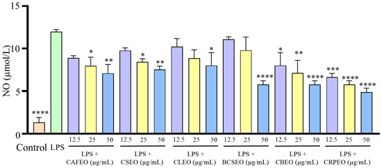 The levels of NO also showed a significant decrease after treatment with different essential oils at concentrations of 12.5, 25, and 50 μg/mL, with inhibition rates of 25.82 ± 3.89%, 33.52 ± 6.99%, and 40.93 ± 7.38% in CAFEO; 18.41 ± 4.27%, 29.67 ± 1.55%, and 37.09 ± 1.94% in CSEO; 14.56 ± 9.71%, 26.10 ± 6.60%, and 32.97 ± 13.99% in CLEO; 7.42 ± 0.39%, 18.13 ± 14.76%, and 51.92 ± 2.72% in BCSEO; 32.97 ± 13.99%, 40.38 ± 13.60%, and 51.92 ± 2.72% in CBEO; and 44.51 ± 2.33%, 51.92 ± 2.72%, and 59.34 ± 3.11% in CRPEO.