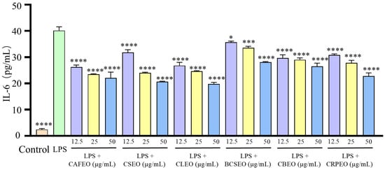 The initial content of IL-6 in the control group was 2.41 ± 0.40 ng/L; after treatment with LPS, the secreted amount of IL-6 increased to 40.14 ± 1.41 ng/L. After treatment with different essential oils at concentrations of 12.5, 25, and 50 μg/mL, the inhibition rates for IL-6 were 34.66 ± 0.29%, 41.40 ± 2.58%, and 45.09 ± 3.62% in CAFEO; 20.63 ± 5.33%, 39.99 ± 1.62%, and 48.55 ± 2.33% in CSEO; 33.14 ± 5.40%, 38.54 ± 2.68%, and 50.68 ± 3.26% in CLEO; 11.40 ± 4.16%, 16.41 ± 1.44%, and 29.98 ± 1.97% in BCSEO; 25.98 ± 5.65%, 27.62 ± 4.32%, and 33.96 ± 0.70% in CBEO; and 23.16 ± 3.73%, 30.64 ± 4.98%, and 43.25 ± 1.02% in CRPEO.