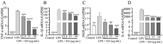 In this study, we evaluated the effects of essential oils on LPS-induced inflammation in RAW 264.7 cells. The CCK-8 assay showed that, compared to the control group, cell viability significantly decreased in the LPS-treated group (Figure 2), which is consistent with previous studies [20]. However, when treated with essential oils, the reduction in cell viability induced by LPS was significantly inhibited, with cell survival rates increasing in a dose-dependent manner, suggesting that the essential oils provided a protective effect against LPS-induced cellular inflammation.
