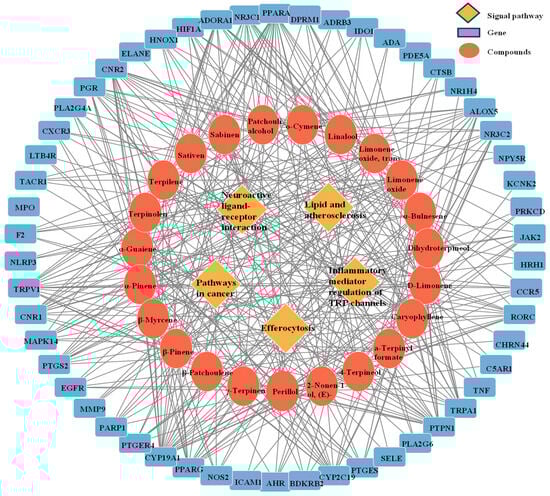 The anti-inflammatory network of the “component–target signaling pathways” regulated by CRPEO. The orange rhomboidal nodes represent pathways; the blue rectangle nodes represent targets; and the round nodes represent components.