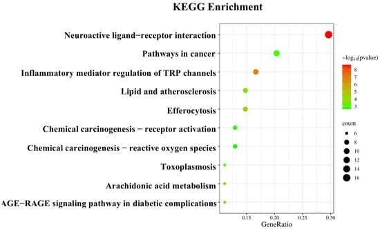 The KEGG pathway analysis, results are shown in Figure 9. The 59 targets are primarily involved in the following signaling pathways: neuroactive ligand–receptor interaction (16 targets), pathways in cancer (11 targets), inflammatory mediator regulation of TRP channels (9 targets), efferocytosis (8 targets), and lipid and atherosclerosis (8 targets). These findings suggest that the anti-inflammatory effects of CRPEO are mediated through a multi-pathway regulatory mechanism.