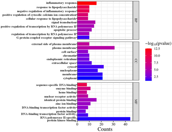The GO enrichment analysis revealed that the 54 targets regulated by CRPEO, which are associated with its anti-inflammatory effects, are primarily involved in a variety of biological processes and molecular functions, including inflammatory response, signal transduction, positive regulation of transcription by RNA polymerase II, plasma membrane, cytoplasm, cytosol, identical protein binding, zinc ion binding, and enzyme binding (Figure 10).