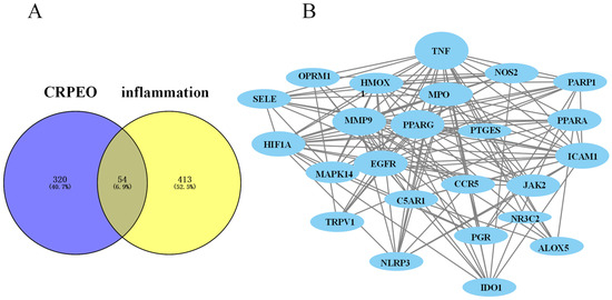 The PPI network analysis. (A) The identification of 54 potential therapeutic targets based on the 23 components of CRPEO in the treatment of inflammation. (B) The protein–protein interaction network of 54 genes.