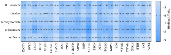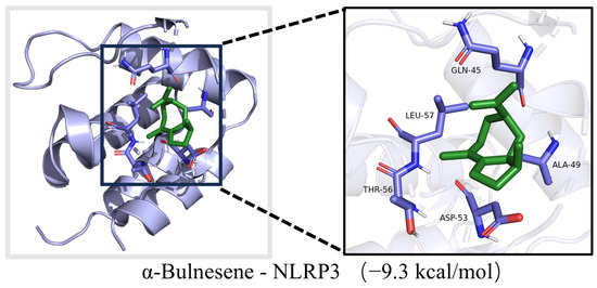 The top three components in CRPEO by content are D-Limonene (76.51%), α-Pinene (2.68%), and Linalool (2.11%). Based on the “degree” values from the network pharmacology analysis, the top three components are α-Bulnesene (0.34%), α-Pinene (2.68%), Terpinyl formate (0.28%). Molecular docking was performed between these components and the core inflammation-related targets. The systems with the lowest docking scores for each component–target pair are shown in Figure 12. Notably, 50.83% of the component–target pairs exhibited docking scores lower than 6 kcal/mol, indicating strong binding affinity. The combinations with the lowest docking energies were α-Bulnesene−NLRP3 (Figure 13). These results suggest that the aforementioned compounds and targets are the primary active compounds and key targets responsible for the anti-inflammatory effects of CRPEO.