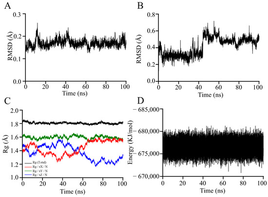 Once the MD simulation was completed, it was necessary to analyze the crucial information related to molecular conformation, structure, and energy. Specifically, the root mean square deviation (RMSD) and radius of gyration (Rg) were calculated to evaluate the convergence and expansion of the molecular structure.