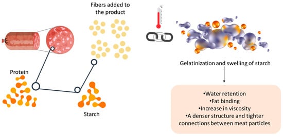 In the case of meat burgers or meatballs, a technological characteristic related to diameter reduction or shrinkage appears, which occurs due to weight loss, protein denaturation and contraction, water evaporation, and fat drainage from the product [103]. Fibres can form a gel that contributes to increased viscosity [154], while the presence of starch and proteins facilitate water retention and fat binding in the product during thermal treatment through the phenomenon of protein gelatinisation and starch swelling (Figure 1) [103,155]. Thus, the addition of plant fibres can minimise the effect of diameter shrinkage by better retaining water and fats [117,126].