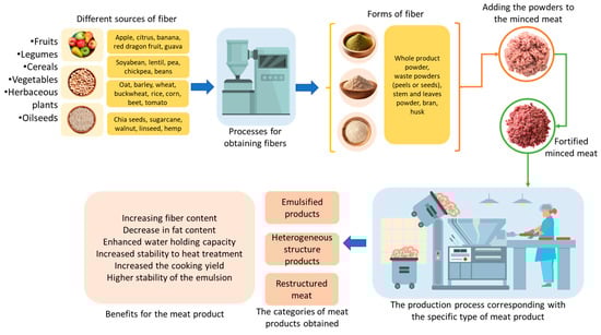 Schematic diagram for the enrichment of meat products with dietary fibres: sources of fibres, forms of addition (predominantly powders), compatible categories of meat products, and the functional benefits of this additions.