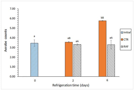 Evolution of aerobic bacteria counts (log CFU·g−1 muscle) in refrigerated Trachurus trachurus subjected to different packaging conditions. Average values of three replicates (n = 3). Standard deviations are indicated by bars. For each packaging condition, different lowercase letters (a, b) indicate significant differences with respect to the refrigeration time; at each refrigeration time, different capital letters (A, B) indicate significant differences with respect to the packaging condition. Packaging conditions: CTR (control; gelatin-packaging condition) and RAF (red alga flour; combined gelatin packaging and alga flour extract treatment), as described in the Section 2.