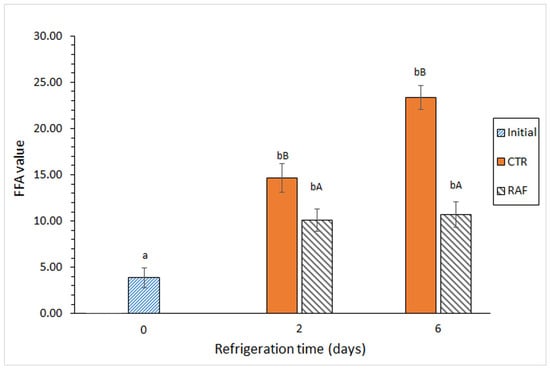 Evolution of the free fatty acid (FFA) value in refrigerated Trachurus trachurus subjected to different packaging conditions. Average values of three replicates (n = 3). Standard deviations are indicated by bars. For each packaging condition, different lowercase letters (a, b) indicate significant differences with respect to the refrigeration time; at each refrigeration time, different capital letters (A, B) indicate significant differences with respect to the packaging condition. The packaging conditions are shown in Figure 1.