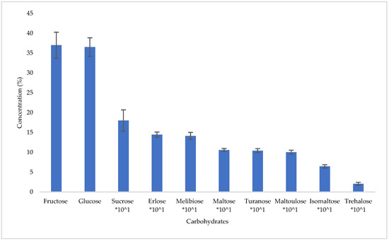 Carbohydrate profiling revealed an average fructose content of 36.99 ± 3.29% and glucose at 36.53 ± 2.34% (Figure 3), the sum of which (73.52%) is above 60%, the lower limit for blossom honeys [22].