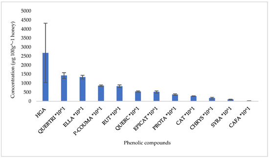 Regarding phenolic compounds, the homogentisic acid was detected in higher concentrations (2681.1 ± 1645.5 μg 100 g−1 honey) (Figure 4), in agreement with other studies, proposing the specific compound as a potential origin marker [8,12].