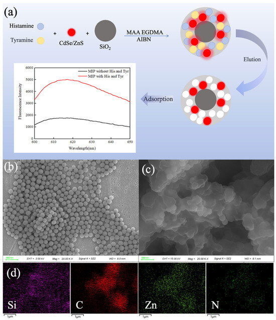 (a) Principle diagram and characterization of CdSe/ZnS-MIP; SEM images of (b) SiO2 and (c) CdSe/ZnS-MIP; EDS images of (d) CdSe/ZnS-MIP. (His and Tyr: abbreviations for histamine and tyramine).